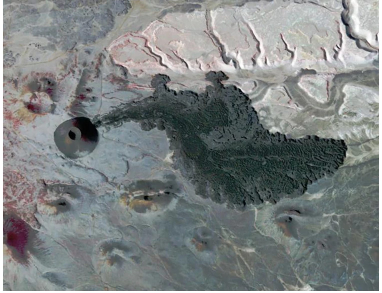 Una vista satelital del cráter SP en Arizona muestra el cráter volcánico y el flujo de lava que sirven como paisaje lunar simulado para los astronautas en entrenamiento. Crédito: NASA/GSFC/METI/ERSDAC/JAROS y equipo científico ASTER de EE. UU. y Japón