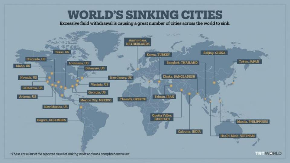 Según el estudio, el hundimiento se debe en parte al peso de los edificios y la infraestructura, pero también al bombeo de agua de acuíferos debajo de las ciudades, así como a la extracción de petróleo y la minería.